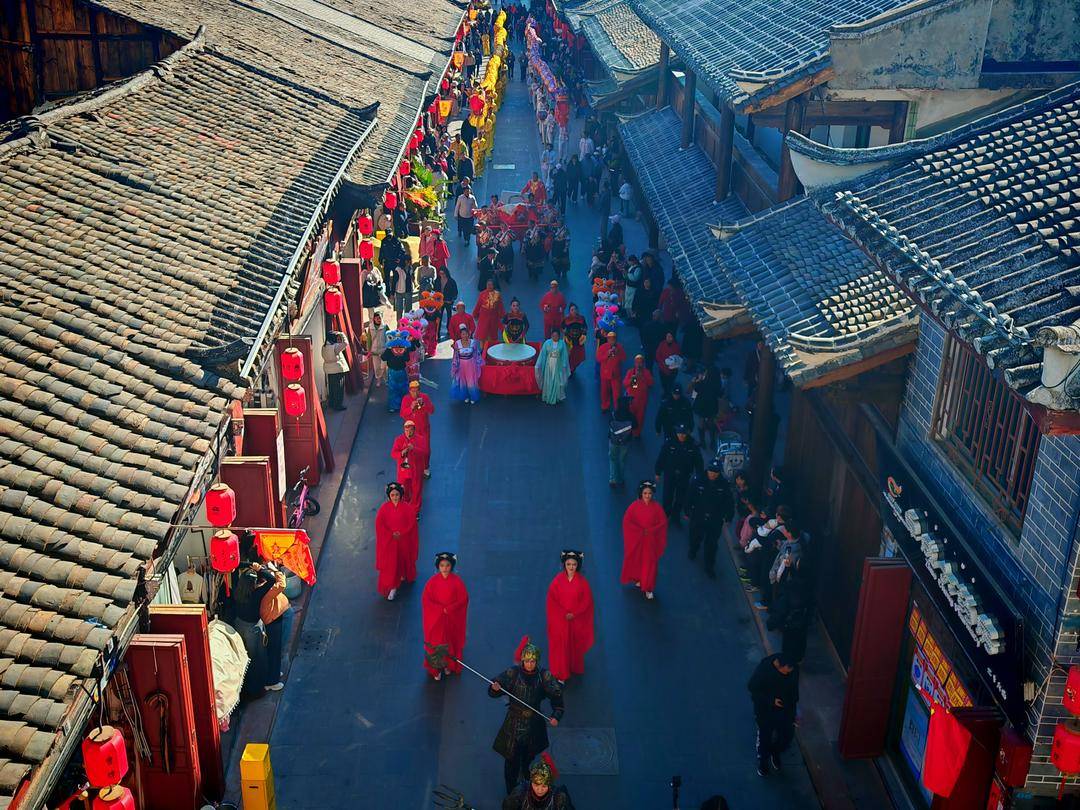 下午3时,“年猪宴”现场锣鼓喧天。八名汉子抬着身披红绸、膘肥体壮的年猪,在舞龙和小狮子的簇拥下,沿着会理古城巡游,热闹非凡。