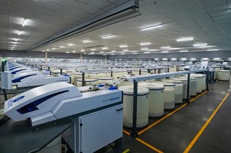 走进位于四川井研经济开发区现代纺织园的帛宇年产26万锭绿色生态智能纺纱项目车间,眼前没有想象中棉絮纷飞的场面,取而代之的是整洁无尘、井然有序智能化设备生产场景。